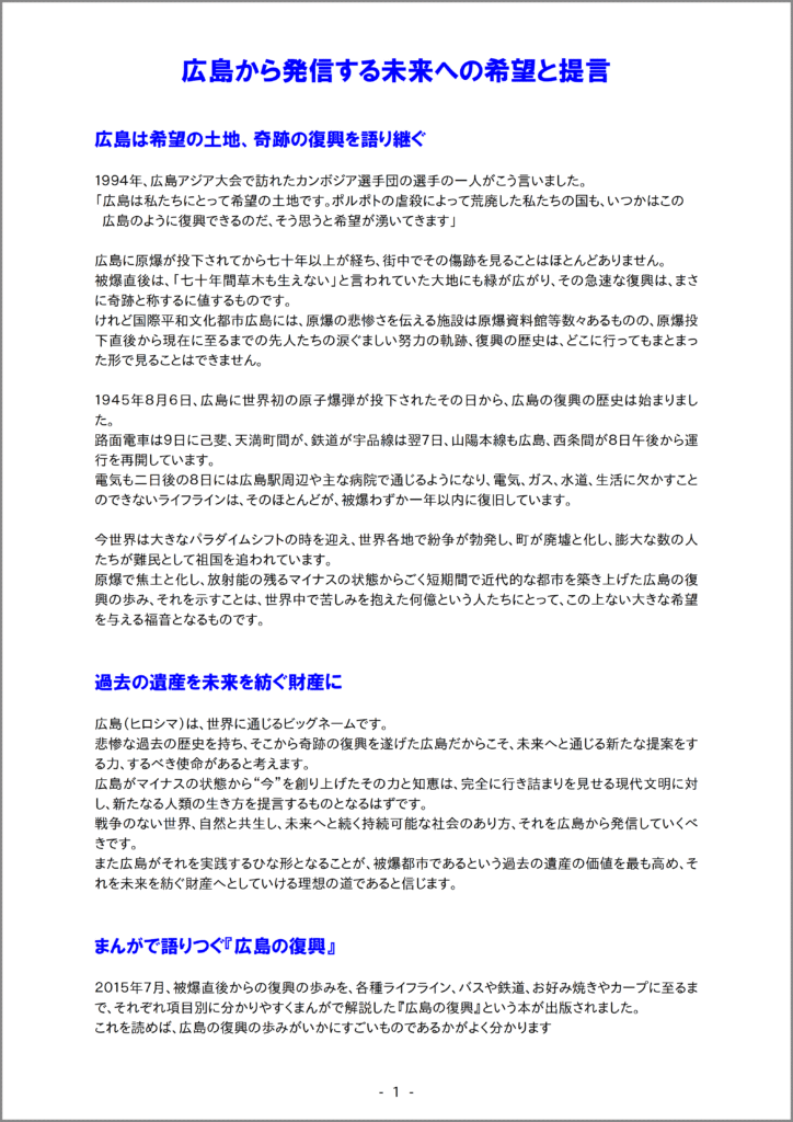 そしてそれとともに、戦後わずかな期間で中四国最大の都市として復興を遂げたこの広島のパワーを、今も戦禍や災害、民族紛争等で壊滅的被害を受けている国や地域の人々に、復興への希望の道筋として示していくことも、広島に課せられた大切な役割であると考えています。